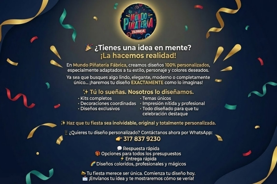 En El Mundo Piñatería Fábrica, nuestra misión es transformar tus eventos en momentos mágicos y vibrantes. No somos solo una fábrica de piñatas; somos tu destino completo para kits de fiesta que abarcan desde cumpleaños hasta primeras comuniones y eventos especiales.Cada artículo que ofrecemos es seleccionado con esmero para garantizar que tu celebración sea única y llena de color.